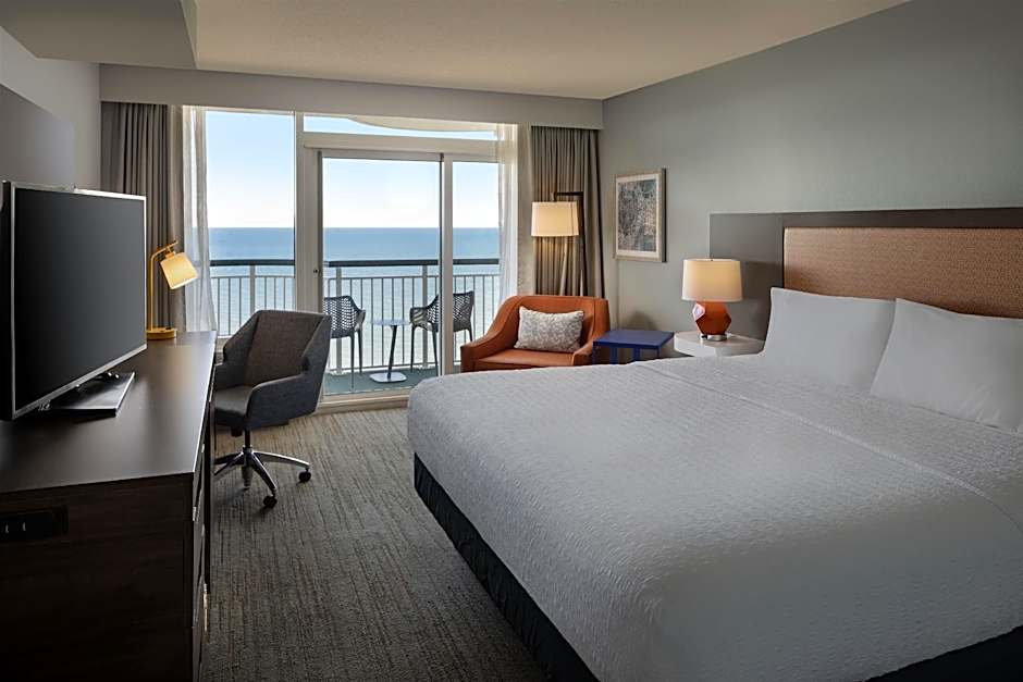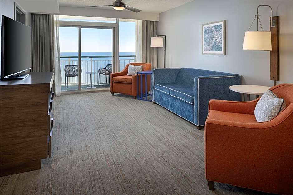 This suite features a balcony with an ocean view, separate living area, desk, 42-inch flat-screen TV, and sofa bed. A coffee machine, small refrigerator, and microwave are also included.